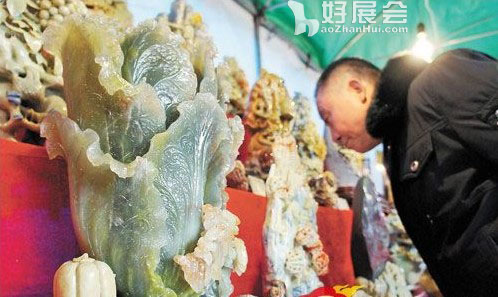12月20日,首屆奇石玉器展目前正在市文化工藝品市場舉行,來自全國各地上百家參展商擺開龍門陣,拿出和田玉、壽山石、靈璧石、孔雀石、瑪瑙膽、水晶石、翡翠等看家寶貝爭奇斗艷,展會將持續到月底。圖為一位市民仔細研究精美的青田玉雕。