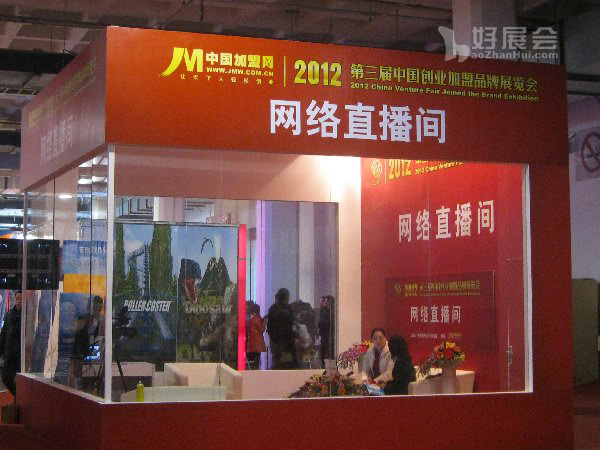 2012年2月18日,“2012第三屆中國創(chuàng)業(yè)加盟品牌展覽會”在中國國際展覽中心(北京三元橋)隆重召開。本次展會匯聚了18大行業(yè)等眾多知名品牌參展,吸引了數(shù)萬投資創(chuàng)業(yè)者前來參觀。而展覽會的網(wǎng)絡(luò)直播間更是矗立在展會現(xiàn)場,格外顯眼。