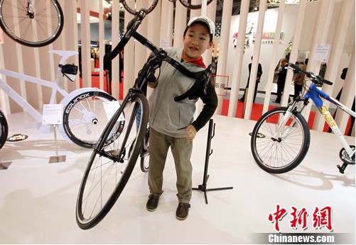 4月5日,2012上海臺(tái)灣名品博覽會(huì)在上海世博展覽館開幕,其中“臺(tái)灣精品館”10項(xiàng)創(chuàng)新產(chǎn)品擁有全球第一殊榮,成為各界矚目焦點(diǎn)。圖為用碳纖維制作的全世界最輕的自行車,僅六點(diǎn)七公斤,兒童也能輕易提起。(來(lái)源:中新網(wǎng))