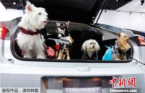 2012年4月11日,美國紐約車展上,雪佛蘭廠商為了宣傳汽車的安全性,請來幾只小狗做起了車模。(來源:中新網(wǎng))