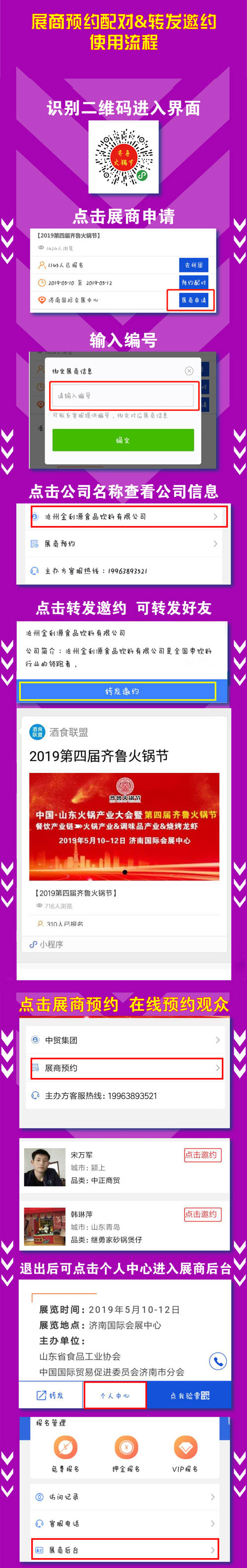 展商通過小程序報名后可以提前查看報名觀眾并與觀眾預約,展商還可以轉發邀約觀眾前來參加本屆齊魯火鍋節。預約配對與轉發邀約流程如下: