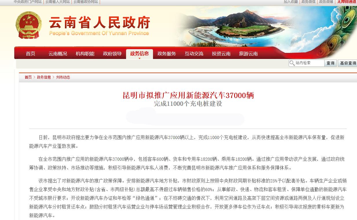 日前,昆明市政府提出要力爭在全市范圍內(nèi)推廣應(yīng)用新能源汽車37000輛,其中包括客車600輛、貨車和專用車18200輛、乘用車18200輛,11000個充電樁建設(shè),從而快速提高全市新能源汽車保有量,促進(jìn)新能源汽車產(chǎn)業(yè)蓬勃發(fā)展。并推出了一系列對新能源汽車的推廣的利好政策: