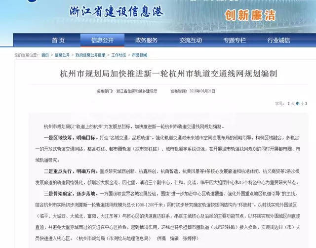 2018年8月21日,浙江省住房和城鄉建設廳官網上發布了一則和杭州軌道交通有關的信息——杭州市以“軌道上的杭州”為發展總目標,杭州市規劃局正在加快推進新一輪杭州市軌道交通線網規劃編制。