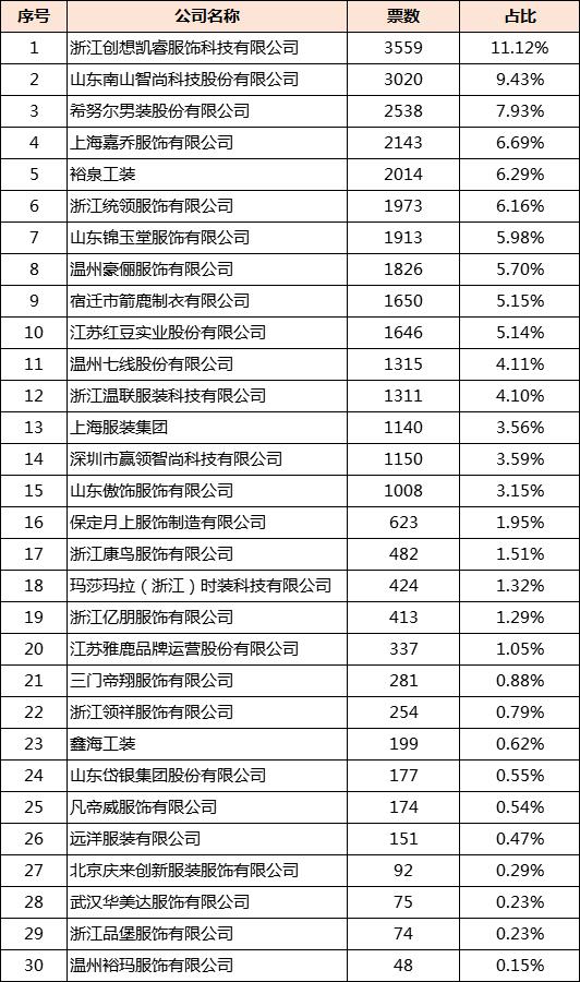 活動自舉辦以來,得到了許多職業(yè)裝企業(yè)的熱烈反響,報名者絡(luò)繹不絕。5月28日至6月28日,網(wǎng)絡(luò)投票,網(wǎng)絡(luò)投票評分占總分值10%,現(xiàn)公布網(wǎng)絡(luò)投票結(jié)果: