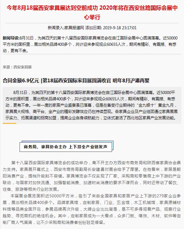 2020年9月17-20日,匯聚眾多期待的第19屆西安國際家具博覽會暨西安全屋定制家居展覽會(以下簡稱西安家具展)將在西安國際會展中心盛大啟幕,呈現一場精彩大氣的家具展,為大型會展活動再添濃墨重彩的一筆。
