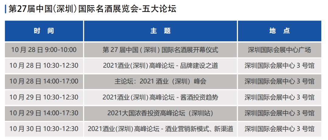 此外, 酒業(深圳)峰會、酒業(深圳)高峰論壇 - 品牌建設之道、酒業(深圳)高峰論壇 - 醬酒投資趨勢、酒業(深圳)高峰論壇 - 酒業營銷新模式、新渠道等四大論壇都將展現酒業的前沿信息與風向、觀點與價值的碰撞。