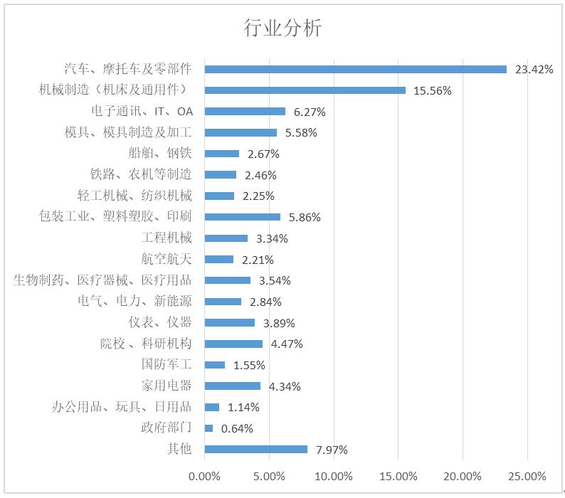 參觀展會的企業行業,以汽車、摩托車及零部件企業最多,占到總數的23.42%,其次為機械制造(機床及通用件),占15.56%。此外,電子通訊、模具、船舶、鋼鐵、鐵路、農機、輕工、橡塑包裝、工程機械、國防軍工、航空航天、生物醫藥、家電等制造行業均有涉及。