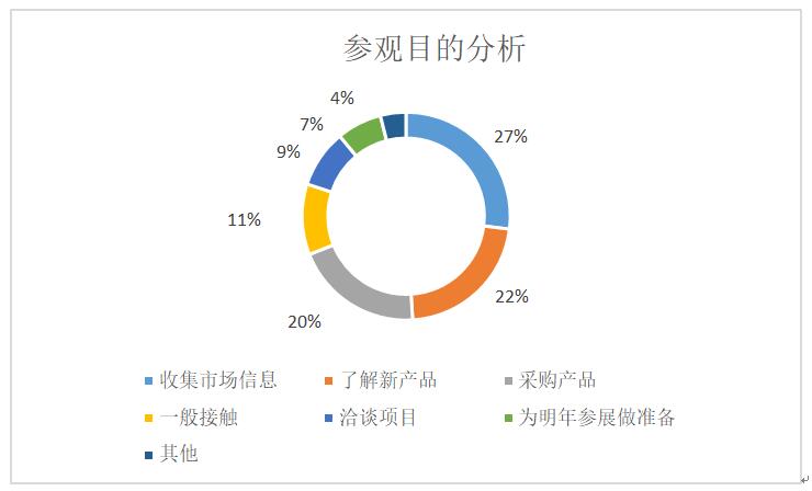 專業觀眾的參觀目的有“收集市場信息”“了解新產品”“采購產品” “一般接觸”“洽談項目”“為明年參展做準備”,比重依次降低。