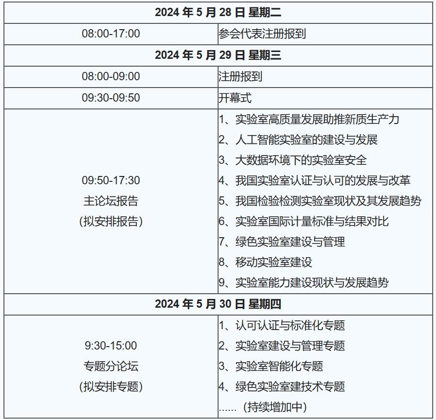 為推進我國實驗室技術的發展,提升實驗室綜合水平,促進國內外行業間的相互交流與合作,中國儀器儀表行業協會、世信國際會展集團研究決定于 2024年5月29日-30日在中國國際展覽中心順義館舉辦“第五屆中國實驗室發展大會”(以下簡稱大會),本屆大會將與第二十一屆中國國際科學儀器及實驗室裝備展覽會同期召開。 本屆大會將繼續以“智慧、安全、綠色、創新”為主題,聚焦我 國實驗室建設與管理、實驗室安全、智慧實驗室、實驗室認證認可、 實驗室數據管理、危化品管理、標準物質、實驗動物等話題,進行深入研討和經驗交流。